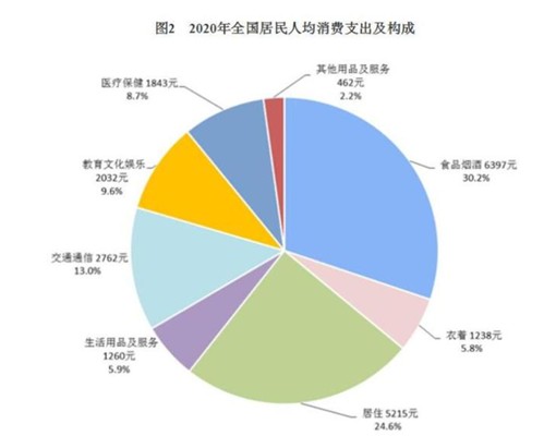 2020年,全国居民人均食品烟酒消费支出6397元,增长5.1%,占人均消费支出的比重为30.2%;人均衣着消费支出1238元,下降7.5%,占人均消费支出的比重为5.8%;人均居住消费支出5215元,增长3.2%,占人均消费支出的比重为24.6%;人均生活用品及服务消费支出1260元,下降1.7%,占人均消费支出的比重为5.9%;人均交通通信消费支出2762元,下降3.5%,占人均消费支出的比重为13.0%;人均教育文化娱乐消费支出2032元,下降19.1%,占人均消费支出的比重为9.6%;人均医疗保健消费支出1843元,下降3.1%,占人均消费支出的比重为8.7%;人均其他用品及服务消费支出462元,下降11.8%,占人均消费支出的比重为2.2%。