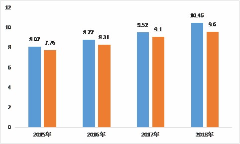 2014年国家高新区总产值为6.96万亿元,低于国家经开区的7.65万亿元;2015年国家级高新区以8.07万亿元的总产值实现赶超,且距离正在逐渐加大,到2017年国家级高新区产值达到9.52万亿元,较国家级经开区多0.41万亿元。预计随着国家级经开区数量的稳定,以及国家级高新区的持续发展,二者产值规模不断拉大将成为常态,国家家高新区的规模优势将持续凸显。