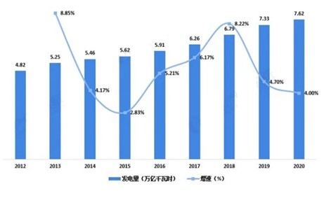 近年来,我国整体上电力供应能力不断加强。2012-2020年,我国全国全口径发电量不断增加。根据中电联数据显示,2020年全国全口径发电量为7.62万亿千瓦时,比2019年增长4.0%。
