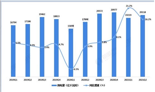 图表:2019-2021年各季度全社会用电量及增速(单位:亿千瓦时,%)