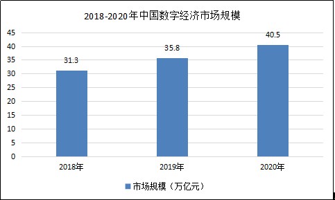 据数据显示,2018年中国数字经济市场规模为31.3万亿元,2019年中国数字经济市场规模为35.8万亿元,2020年中国数字经济市场规模为40.5万亿元同比增速13.16%。