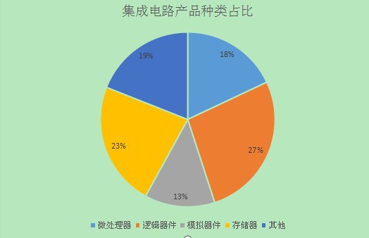集成电路按照产品种类又主要分为四大类:微处理器(约占18%),存储器(约占23%),逻辑器件(约占27%),模拟器件(约占13%)。