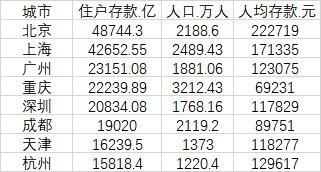 北京人均存款超20万元2021年共有8个城市住户存款余额超过1.5万亿元,分别是北京、上海、广州、重庆、深圳、成都、天津...