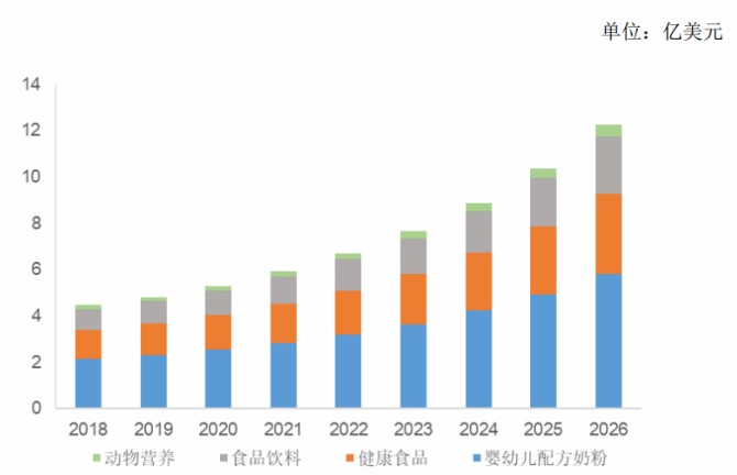 ARA和藻油DHA主要应用于婴幼儿配方奶粉、健康食品、动物营养、食品饮料四大领域。2015年至2026年,各应用领域对于ARA和藻油DHA的需求均呈逐年上涨趋势,为ARA和藻油DHA的行业增长提供了广阔空间。预计到2026年,婴幼儿配方奶粉对ARA和藻油DHA的需求将占到全行业的47.43%。