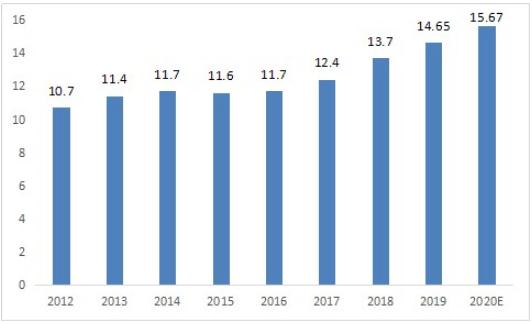 全球半导体靶材行业市场规模整体波动不大,分别为11.4亿美元、11.7亿美元、11.6亿美元和11.7亿美元。2017年和2018年市场规模增长加速,分别增长为为12.4亿美元和13.7亿美元,增速分别为5.6%和10.5%。