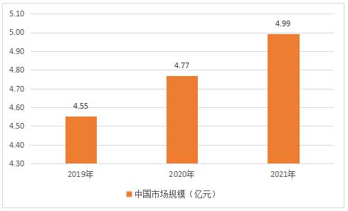 2019年中国花青素市场规模为4.55亿元,2020年花青素市场规模为4.77亿元,2021年市场规模达到4.99亿元。