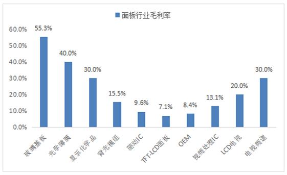 LCD产品价值链构成"微笑曲线",即LCD产业链的毛利率呈现U型,左边高毛利率的是上游基础材料(40%以上毛利率),中间低毛利率的是中游面板制造(10-20%的毛利率),右边较高毛利率的是下游终端产品(毛利率20-30%)。