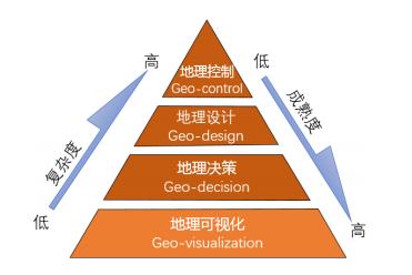 IT技术的不断创新,极大地促进了GIS技术发展,提升了地理智慧。同时,地理智慧也解决了传统IT所无法解决的与位置相关的复杂问题,地理智慧创新着IT价值。地理智慧分为地理可视化(Geo-visualization)以及以空间分析技术为基础进行的地理决策(Geo-decision)、地理设计(Geo-design)和地理控制(Geo-control),很多行业应用都会经历这几个阶段。