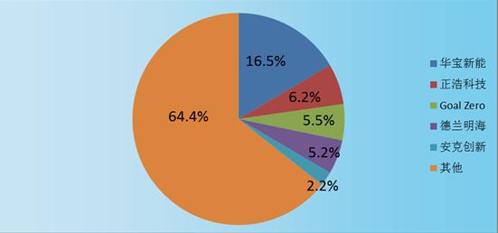 从便携式户外储能电源行业市场饱和度来看,中国化学与物理电源行业协会相关数据显示,华宝新能、正浩科技、Goal Zero、德兰明海、安克创新品牌的便携式储能电源的市场份额稳居前列,华宝新能占据第一的市场份额,为16.5%,正浩科技、Goal Zero、德兰明海、安克创新依次占据的市场份额为6.2%、5.5%、5.2%、2.2%。