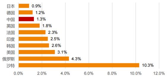 我国经济总量持续增长,国防费用投入稳步增加。2016-2019年,我国军费占GDP比重分别为1.31%、1.25%、1.20%、1.20%,基本保持稳定。2020年,国防军费增速6.7%,规模达到约1.27万亿,连续四年突破万亿。但相比发达国家2%~4%的军费GDP占比,中国军费负担相对较轻,因此为后续军费的增加留下了增长空间。