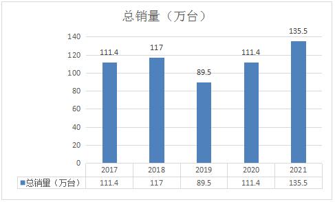 2019-2021年我国房车空调总销量在出口需求带动下,总销量呈现出增长态势,2021年我国房车空调总销量达到了135.5万台。