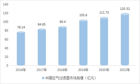 空气过滤器市场空间与国内空气质量情况息息相关,在国内持续加强空气质量优化的相关政策支持下,空气过滤器行业市场规模迅速增加。2019年我国空气过滤器行业市场规模达到105.6亿元,随着经济结构的不断转型和对空气质量要求的不断提升,对空气过滤器的需求会不断增加,2021年因为疫情居民对于空气洁净更加注重,我国空气过滤器行业市场规模达到120.52亿元。