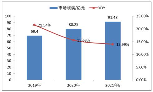 图表:2019-2021年天然植物精油行业市场规模及增速