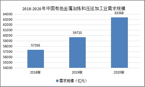 图表:2018-2020年中国有色金属冶炼和压延加工业需求规模情况