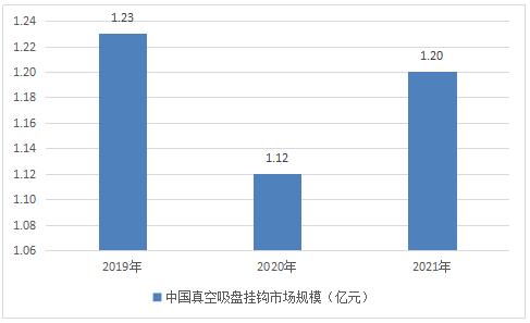 2019年中国真空吸盘挂钩市场规模为1.23亿元,2020年受疫情影响市场规模为1.12亿元,2021年市场规模回升至1.2亿元。