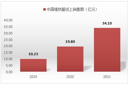 2019-2021年植物基各类产品线上下配售额呈现逐年快速增长趋势,2021年植物基产品销售额达34.1亿元。