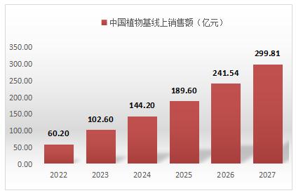 随着健康消费理念的深入,植物基产品多元化的发展,预计2022-2027年植物基产品将保持快速增长趋势,2027年植物基产品线上销售额将达299.81亿元。