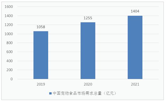 图表:2019-2021年中国宠物食品市场需求总量