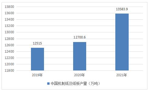 图表:2019-2021年中国机制纸及纸板产量(万吨)