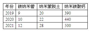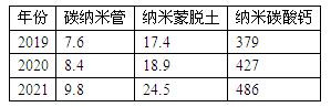 图表:2019-2021年国内部分纳米材料产能(万吨)