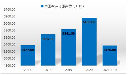 我国十种有色金属产量一直呈增长趋势,增速有所放缓。2019年我国十种有色金属为5841.59万吨,同比增长2.70%。规上有色金属工业增加值增长8.2%,高于工业平均2.5个百分点。2021年1-10月产量为5376.0万吨。