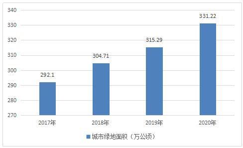 城市绿化是指在城市中植树造林、种草种花,把一定的地面空间覆盖或者是装点起来。城市绿化具有改善城市生态环境,维护城市生态平衡的重要作用。近年来,我国各城市地区不断增加当地的绿化面积,提高城市名誉。国家统计局数据显示,近几年,我国城市绿化面积逐年增加。2019年我国城市绿化总面积为315.3万公顷,同比2018年增长了3.5%。2020年绿地面积为331.22万公顷。
