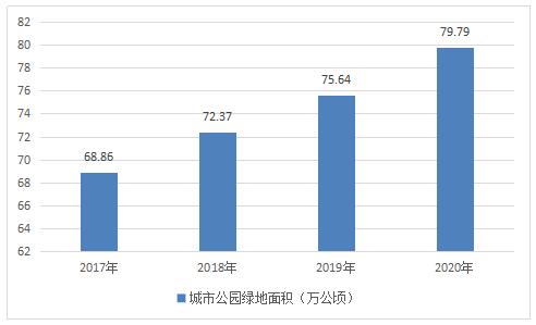 2017年城市公园绿地面积为68.86万公顷,至2020年城市公园绿地面积增长至79.79万公顷。