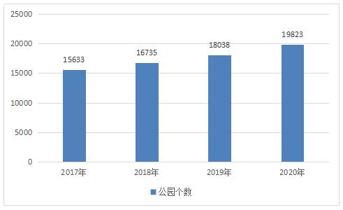 2017年我国共有15633个公园,2019年有公园18038个,2020年公园达到19823个。
