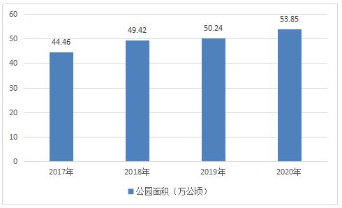2017年中国公园面积为44.46万公顷,至2020年公园面积达到53.85万公顷。
