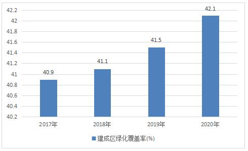 2017年中国建成区绿化覆盖率为40.9%,2019年建成区绿化覆盖率达到41.5%,2020年为42.1%。