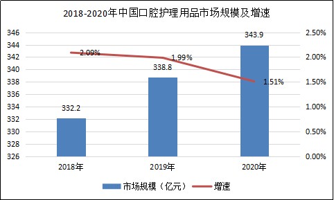 图表:2018-2020年中国口腔护理用品市场规模及增速情况