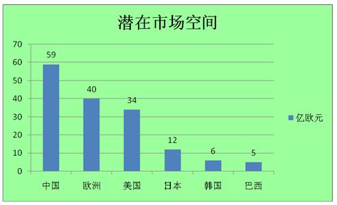 2021年,全球潜在市场规模最大的三个地区依次为中国(59亿欧元)、欧洲(40亿欧元)、美国(34亿欧元)。