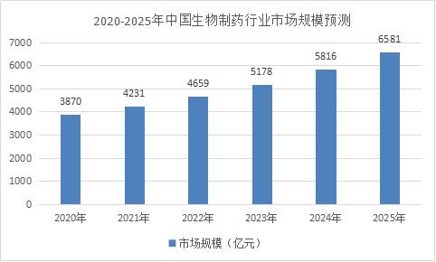 生物医药行业作为国家战略前沿领域产业的地位,国家产业政策的大力支持将加速推动生物制药行业的研发投入及产业化进程,为我国生物制药产业创造了重大的发展机遇,预计2025年生物制药行业市场规模将超过6500亿元。
