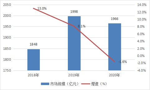 图表:2018-2020年中国高端啤酒行业市场规模及增速