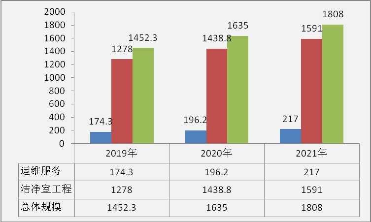 中研普华产业研究院相关数据统计显示,2019-2021年期间,我国洁净室服务行业市场规模逐年递增,2019年,我国洁净室服务行业总体市场规模达到1452.3亿元,其中洁净室工程市场规模在1278亿元左右,洁净室运营维护服务在174.3亿元左右。2021年,我国洁净室服务行业总体市场规模达到1808亿元,其中洁净室工程市场规模在1591亿元左右,洁净室运营维护服务在217亿元左右。
