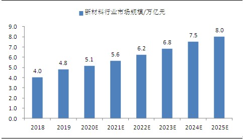 当前国内已形成环渤海、长三角和珠三角地区三大新材料产业聚集区,区域集群化态势正在凸显。国内新材料产业还处于高速发展期,预计产业规模将从2018年的4万亿元发展到2025年的8万亿元。