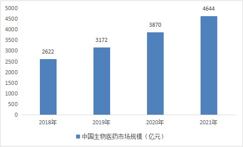 在技术进步、产业结构调整和消费支付能力增加的驱动下,中国生物医药市场规模也呈稳定上升态势。2018年到2021年,我国生物医药市场总体规模从2622亿元增加到4644亿元,年均复合增长率达20%。