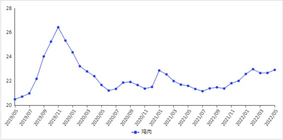 5月份,鸡肉集市均价每公斤 22.92 元,环比涨 1.1%,同比涨 3.2%。从周价看,5 月份禽肉连续 4 周小幅上涨,第1 周、第 2 周、第 3 周、第 4 周价格分别为每公斤 22.87 元、22.90 元、22.94 元、22.95 元,环比分别涨 0.3%、涨 0.1%、涨 0.2%、持平。从养殖效益看,5 月份全国肉鸡棚前收购价上涨,养殖整体处于盈利状态,但养殖利润比 4 月份略所下滑。据国家发展改革委价格监测中心发布,5 月份活鸡价格每公斤 8.97 元,环比涨 2.5%,平均每只鸡盈利 2.08 元,环比减 1.7%。