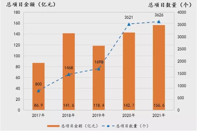 2021年全国开展公开招投标的土壤治理修复项目共计3626个,项目总金额约为156.6亿元,覆盖全国除港澳台以外的31个省(区、市)。土壤环境修复项目数量也逐年增加,2020年增加幅度最为明显,较2019年翻一番,2021年持续增长。项目总金额分别为86.9亿元、141.6亿元、118.4亿元、142.7亿元、156.8亿元,项目金额在2021年达到了最高值,首次超过了150亿元。