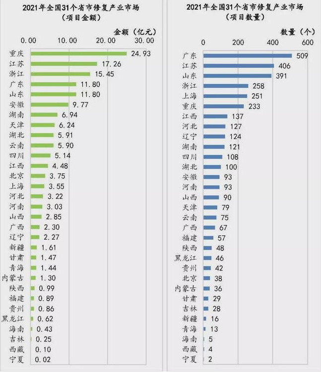 从项目金额来看,2021年重庆市公开招投标的项目金额最高,高达24.93亿元,排在前2-5名的江苏、浙江、广东、山东等省的项目金额在11.8亿-17.26亿元之间,排在6-15名的安徽、湖南、天津、湖北、云南、四川、江西、北京、上海、河北等省(区、市)的项目金额在3.22亿-9.77亿之间。宁夏和西藏启动项目金额分别为200万元和1000万元。