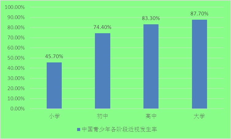中国青少年学习时间长+户外活动少,近视高发。2018年PISA测试中,中国学生以平均每周学习57小时居于榜首,而在全球体育活动报告中,中国组织青少年户外活动情况和综合评价均居于榜尾。“学习时间长+户外活动少”造成中国青少年各阶段近视发生率不断上升,大学生近视率达到87.7%。