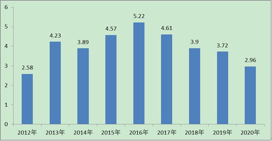 图表:2012-2020年中国智能手机出货量(单位:亿部)
