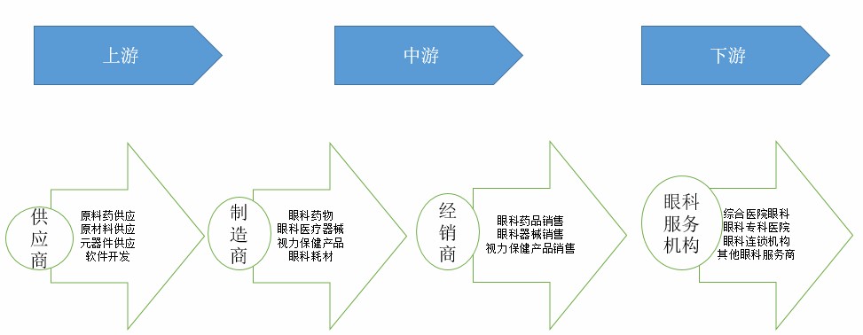 眼科医疗器械上游主要包括元器件的供应,软件开发,中游包括医疗器械和眼科耗材,下游则为经销商和各类眼科服务机构。