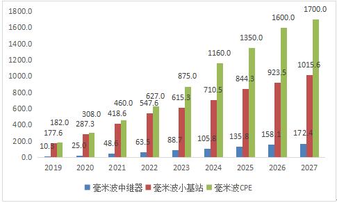 图表:2019-2027年全球5G毫米波设备产量情况(万)