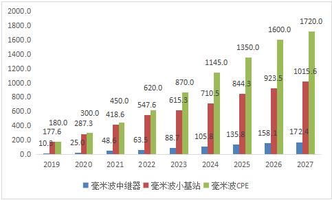 图表:2019-2027年全球5G毫米波设备需求及趋势预测