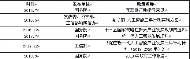 国家层面相继出台人工智能政策从总体布局人工智能发展目标,鼓励人工智能技术的研发,建设人工智能资源库,培育所需人才与互联网+模式相结合,支持人工技能与实体经济融合发展,促进人工智能对经济的发展。