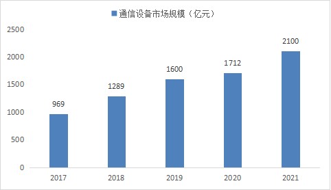 根据工信部数据统计,2017-2021年通信设备行业呈现逐年增长趋势,2020年受疫情影响增长趋势有所放缓,2021年通信设备行业市场规模为2100亿元,较2017年增长116.7%。