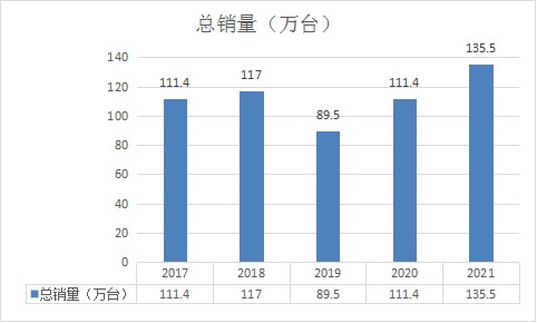 2019-2021年我国房车空调总销量在出口需求带动下,总销量呈现出增长态势,2021年我国房车空调总销量达到了135.5万台。