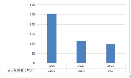 2019-2021年随着我国涂料行业整体市场集中度的提升,限额以下企业不断被清退,行业企业人员规模呈现出连续下降态势,2021年行业人员规模降至为99.78万人。