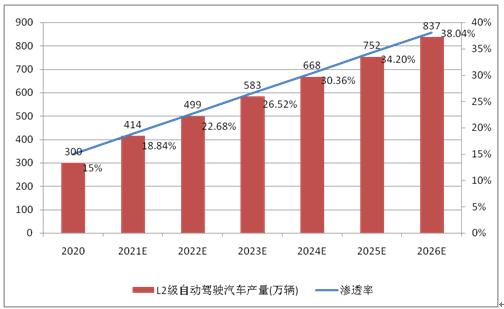 2020年,国内汽车产量达到2522.5万辆,乘用车产量达到1999.4万辆,自动驾驶汽车的产量达到300万辆,乘用车市场自动驾驶汽车的渗透率达到15%左右。